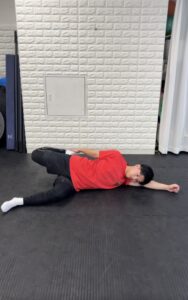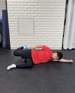 ③上の脚をなるべくグッと引き上げて腰が反らないようにし、下の手で膝を抑えます!